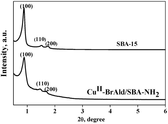 The characteristic mesoporous hexagonal structure of the SBA-15 support and the Cu(II)-BrAld/SBA-15-NH2 sample was confirmed by the XRD measurements (Figure 2). The XRD pattern of SBA-15 presented a strong reflection peak at 2θ = 0.89° attributed to the (100) plane and two smaller diffraction peaks at 1.47° for the (110) plane and 1.67° for the (200) plane. After indexation of the three peaks to a hexagonal lattice, the d-spacing values are 99.52, 60.41 and 53.32 Å, respectively, and the unit cell parameter, a0, of 115.05 Å, characteristic of a well-ordered SBA-15-type material [26]. However, Cu(II)-BrAld complex immobilization led to minor changes in the low-angle XRD pattern. Thus, an increase in the baseline, a slight shift in the 2θ values of the three characteristic reflections and a decrease in the (100) peak relative intensity for the Cu(II)-BrAld/SBA-15-NH2 as compared to the SBA-15 support were evidenced (Figure 2). This behavior can be ascribed to the decrease in the crystallinity of the SBA-15 after functionalization and complex immobilization, as well as to the functionalization in the inner surface of the mesoporous channels, as reported for other functionalized mesoporous silica [27].