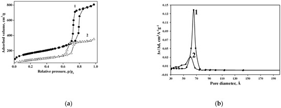 (a) N2 adsorption–desorption isotherms and (b) pore size distribution of SBA-15 (1) and Cu(II)-BrAld/SBA-15-NH2 (2).