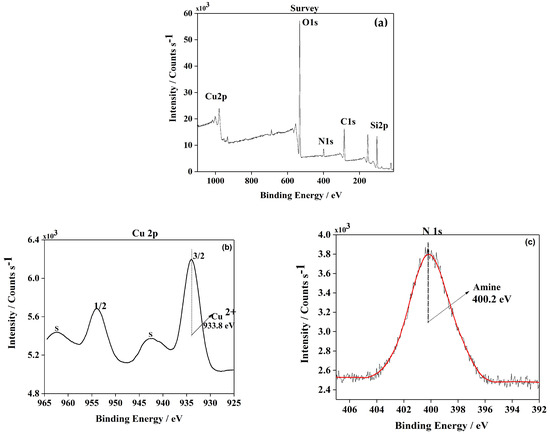 To further characterize this new heterogeneous catalyst, its chemical structure and surface composition were determined by XPS analysis. An XPS spectrum of the Cu(II)-BrAld/SBA-15-NH2 sample is shown in Figure 5a. The Si2p peak position for the copper complex immobilized into SBA-15 silica was in agreement with SiO2-type material. As expected, the spectra showed peaks for N1s at 400.2 eV assigned to amines and imines (Figure 5b). The spectra concerning Cu2p core-level excitation are presented in Figure 5c. The sample shows two main peaks centered at ~933.8 eV and 964.2 eV associated with Cu 2p3/2 and 2p1/2, respectively, being accompanied by shake-up satellite peaks. It was proven that satellite bands were generated by an electron transfer from a ligand orbital to the 3d orbital of Cu, confirming that the d level was not filled [28,29,30]. This np(ligand)→3d(metal) transition is characteristic of bivalent copper. The Cu+ and Cu0 species have filled levels and consequently could not participate in this electron transfer [31]. Furthermore, the Cu2p3/2 peak is typical of copper (II) complexes in a mixed N, O coordination sphere [32].