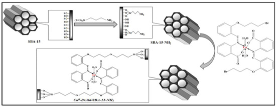 SBA-15 silica support was synthesized according to a literature procedure [42] as follows: 1.5 g of Pluronic P123 surfactant templating agent was dispersed in a mixture of 15 g of H2O and 45 g of 2 M HCl by stirring for 4 h at 40 °C. A 3.15 g quantity of TEOS was further added and the reaction mixture was maintained under stirring at 40 °C for 24 h. After a hydrothermal treatment in a Teflon-lined autoclave at 100 °C for 2 days, the solid was centrifuged, filtered, washed with deionized water and dried in air at room temperature. The final SBA-15 support was obtained after solid calcination at 550 °C for 8 h under airflow. The amino-functionalization of the inorganic support was carried out according to a post-grafting procedure [43] consisting of mixing 50 mL of dry toluene with 1 g of activated SBA-15 silica and 1 mL of APTES, followed by stirring the solution for 4 h at the reflux temperature of toluene. Thereafter, the NH2-functionalized silica was filtered and washed (using toluene, ethylic alcohol and diethyl ether successively). The surfactant was removed by a Soxhlet extraction with diethyl ether/dichloromethane (v/v, 1/1) at 100 °C. The solid was dried at 130 °C overnight (referred to as SBA-15-NH2).