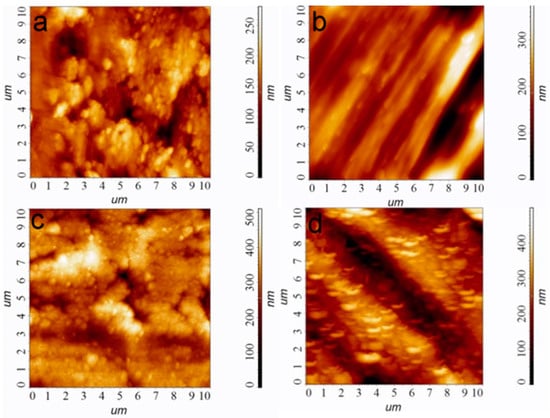 Figure 1. AFM images of the sample surfaces, bare Ti (a), bare Ti* (b), Ir/Ti (c), and Ir/Ti* (d). Scale is 10 × 10 µm. - “Ti*” carriers: surface-polished Ti6Al4V discs; according to AFM data, the ordered grooved altitude differences are up to 300 nm whereas Ra is 60 nm (Figure 1b);