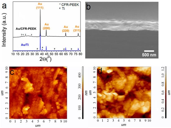 XRD patterns of Au/Ti and Au/CFR-PEEK, where the unlabeled peaks belong to the carrier materials (a); cross-section SEM image of Au/Si (b); AFM images of Au/Ti (c) and Au/CFR-PEEK (d). Scale is 10 × 10 µm.