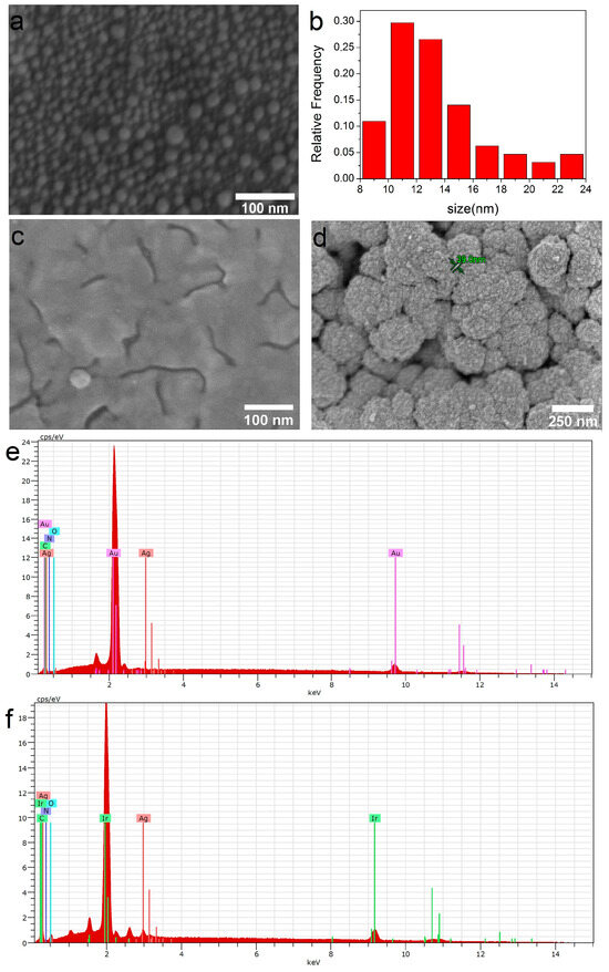 SEM micrographs of the samples obtained via PVD: Ag/CFR-PEEK (a) and corresponding AgNPs size distribution (b); Ag/Au/CFR-PEEK (c); Ag/Ir/CFR-PEEK (d); EDX spectra of Ag/Au/CFR-PEEK (e); Ag/Ir/CFR-PEEK (f).