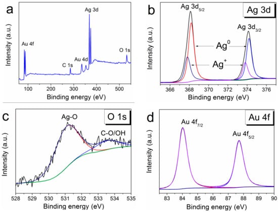 XPS spectra of Ag/Au/CFR-PEEK (a), fitting of Ag3d spectra (b), fitting of O1s spectra (c), and fitting of Au4f spectra (d).