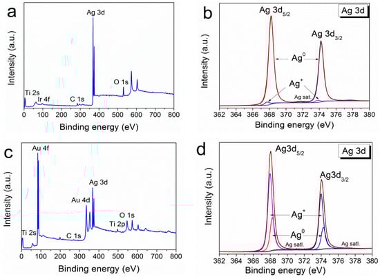 XPS survey spectra of Ag/Ir/Ti (a) with the fitting of Ag3d spectra (b) and XPS survey spectra of Ag/Au/Ti (c) with the fitting of Ag3d spectra (d).