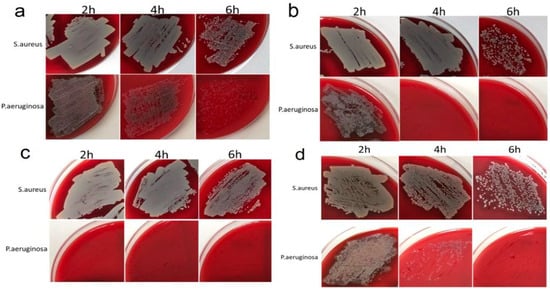 Antibacterial activity profile at 2, 4, and 6 h of Ag/Au/Ti (a), Ag/Ir/Ti (b), Ag/Ir/Ti* (c), and Ag/Ir/CFR-PEEK (d) samples against S. aureus or P. aeruginosa.