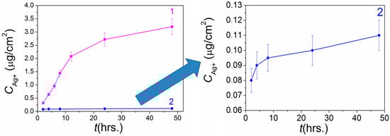 Comparative dynamics of Ag+ release from heterostructures Ag/Ir (curve 1) [26] and Ag/Au (curve 2) prepared via PVD onto Ti carriers.