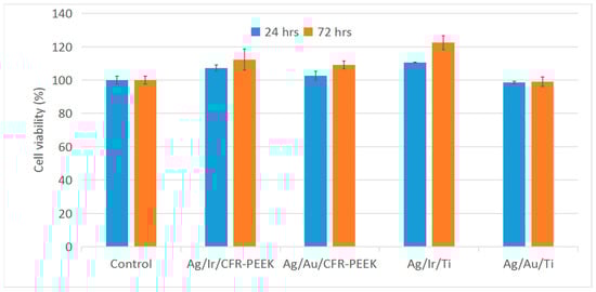 The in vitro cytotoxicity of Ag/Au/Ti, Ag/Au/CFR-PEEK, Ag/Ir/Ti, and Ag/Ir/CFR-PEEK heterostructures was also investigated to determine the possible influence of the chemical form of Ag and the sublayer (Ir, Au) on cell viability. Each series consists of three experimental samples obtained under the same conditions (See details in Section 4.2).