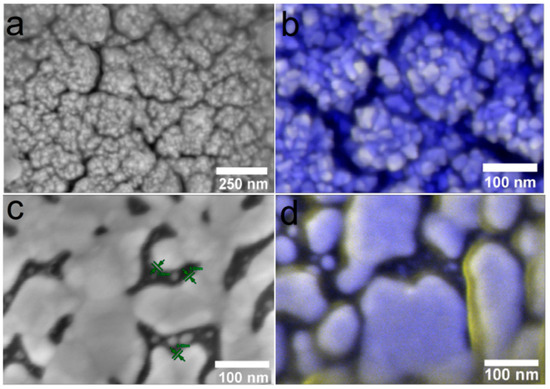 It should be noted that under similar conditions, silver films do not form on the surface of bare biomaterials. A comparison of samples obtained after two consecutive PVD procedures is presented in Figure 3. Only isolated AgNPs with sizes of 5–25 nm are observed on the surface of both CFR-PEEK and Ti (Figure 3a,b).