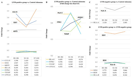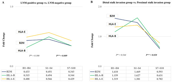 2.5. Changes in HLA-E, B2M, and HLA-B According to Lymph Node Metastasis or Stalk Invasion