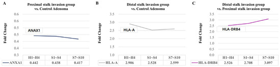 2.3. Differentially Expressed Genes Associated with Proximal and Distal Stalk Invasion