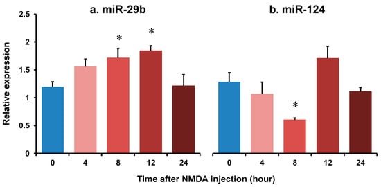 The changes in the relative expression of miR-29b (a) and miR-124 (b) in the retina of after intravitreal NMDA injection. Each datum is expressed as mean ± SEM of 4 (8 h) or 5 (other time points) independent experiments. * p < 0.05 vs. 0 h (before NMDA injection) using Dunnett’s test.