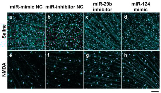 RGCs expressing ECFP in the retina of the B6.Cg-TgN(Thy1-CFP)23Jrs/J transgenic mouse. The images of whole mount of the retina of the eyes treated with 10 nmol/eye miR mimic NC and saline (a), 10 nmol/eye miR inhibitor NC and saline (b), 10 nmol/eye miR-29b inhibitor and saline (c), 10 nmol/eye miR-124 mimic and saline (d), 10 nmol/eye miR mimic NC and 40 nmol/eye NMDA (e), 10 nmol/eye miR inhibitor NC and 40 nmol/eye NMDA (f), 10 nmol/eye miR-29b inhibitor and 40 nmol/eye NMDA (g), and 10 nmol/eye miR-124 mimic and 40 nmol/eye NMDA (h) were taken with a confocal laser microscope. miR inhibitor/mimic and their NC were injected intravitreally 18 h before intravitreal NMDA injection. The retinas were excised 7 days after NMDA injection. Scale bar is 100 μm. Original magnification, ×200.