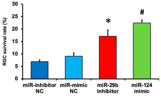 The survival rate of RGCs expressing ECFP in the retina of the B6.Cg-TgN(Thy1-CFP)23Jrs/J transgenic mouse 7 days after NMDA injection. The number of RGCs in the retina of the NMDA-injected eye was divided by that of the contralateral eye, and a percentage of RGC survival rate was calculated. Each datum is expressed as mean ± SEM of 4 (miR mimic NC), 5 (miR inhibitor NC), or 6 (miR-29b inhibitor and miR-124 mimic) independent experiments. * p < 0.05 vs. miR inhibitor NC; # p < 0.05 vs. miR mimic NC using Tukey–Kramer test.