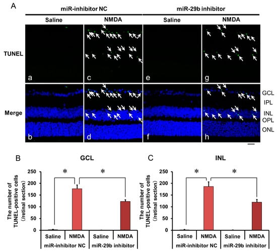 (A) Photomicrographs showing TUNEL staining of the retinas. The eyes were excised 12 h after intravitreal injection of saline (vehicle) or 40 nmol/eye NMDA. The eyes were treated with 10 nmol/eye miR inhibitor NC and saline (a,b), 10 nmol/eye miR-29b inhibitor and saline (e,f), 10 nmol/eye miR inhibitor NC and 40 nmol/eye NMDA (c,d), and 10 nmol/eye miR-29b inhibitor and 40 nmol/eye NMDA (g,h). miR inhibitor and its NC were injected intravitreally 18 h before intravitreal NMDA injection. Panels (b,d,f,h) (Merge) show the TUNEL staining merged with nuclear counterstaining with DAPI. GCL: the ganglion cell layer, IPL: the inner plexiform layer, INL: the inner nuclear layer, OPL: the outer plexiform layer, and ONL: the outer nuclear layer. The nuclei of TUNEL-positive cells are stained green. All the nuclei are counterstained blue. The white arrows represent the TUNEL-positive cells. Scale bar is 50 μm. Original magnification, ×400. (B,C) Effect of miR-29b inhibitor on the increase in the number of TUNEL-positive cells induced by NMDA, examined 12 h after intravitreal NMDA injection. The numbers of the TUNEL-positive cells in GCL (B) and INL (C) per one retinal section are shown. Each datum is presented as mean ± SEM of 5 independent experiments. * p < 0.05 between the indicated pairs using Tukey–Kramer test.