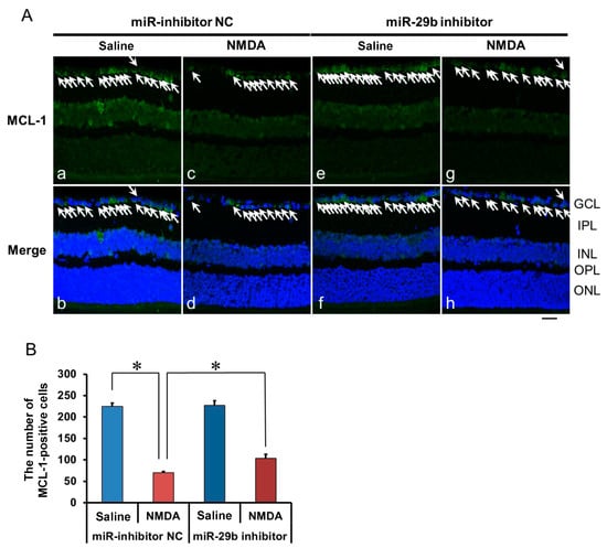 We demonstrated the effects of the miR-29b inhibitor on the change in the expression of MCL-1 in the retina induced by intravitreal NMDA. Representative photomicrographs of the retinal sections obtained 12 h after NMDA injection are shown in Figure 5A. The intravitreal treatment of the miR inhibitor NC 18 h before NMDA injection did not affect the decrease in the number of MCL-1-positive cells induced by intravitreal NMDA (Figure 5A, panels c and d). The intravitreal treatment of the miR-29b inhibitor 18 h before NMDA injection reduced the decrease in the number of MCL-1-positive cells induced by intravitreal NMDA (Figure 5A, panels g and h). The mean numbers of MCL-1-positive cells from five independent experiments are summarized in Figure 5B.