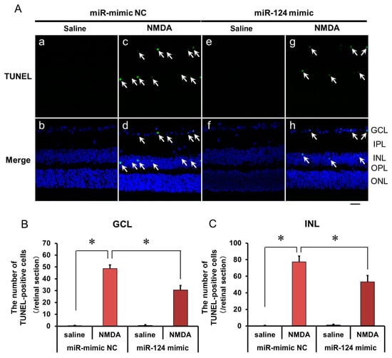 (A) Photomicrographs showing TUNEL staining of the retinas. The eyes were excised 12 h after intravitreal injection of saline (vehicle) or 40 nmol/eye NMDA. The eyes were treated with 10 nmol/eye miR mimic NC and saline (a,b), 10 nmol/eye miR-124 mimic and saline (e,f), 10 nmol/eye miR mimic NC and 40 nmol/eye NMDA (c,d), and 10 nmol/eye miR-124 mimic and 40 nmol/eye NMDA (g,h). miR mimic and its NC were injected intravitreally 18 h before intravitreal NMDA injection. Panels (b,d,f,h) (Merge) show the TUNEL staining merged with nuclear counterstaining with DAPI. GCL: the ganglion cell layer, IPL: the inner plexiform layer, INL: the inner nuclear layer, OPL: the outer plexiform layer, and ONL: the outer nuclear layer. The nuclei of TUNEL-positive cells are stained green. All the nuclei are counterstained blue. The white arrows represent the TUNEL-positive cells. Scale bar is 50 μm. Original magnification, ×400. (B,C) Effect of miR-124 mimic on the increase in the number of TUNEL-positive cells induced by NMDA, examined 12 h after intravitreal NMDA injection. The number of the TUNEL-positive cells in GCL (B) and INL (C) per one retinal section are shown. Each datum is presented as mean ± SEM of 5 independent experiments. * p < 0.05 between the indicated pairs using Tukey–Kramer test.