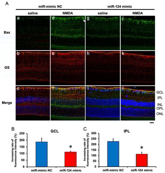(A) Photomicrographs showing immunohistochemistry with anti-Bax antibody (a,d,g,j) and anti-GS antibody (b,e,h,k) of the retinas. The eyes were excised 12 h after intravitreal injection of saline (vehicle) or 40 nmol/eye NMDA. The eyes were treated with 10 nmol/eye miR mimic NC and saline (a,b,c), 10 nmol/eye miR-124 mimic and saline (g,h,i), 10 nmol/eye miR mimic NC and 40 nmol/eye NMDA (d,e,f), and 10 nmol/eye miR-124 mimic and 40 nmol/eye NMDA (j,k,l). miR mimic and its NC were injected intravitreally 18 h before intravitreal NMDA injection. Panels (c,f,i,l) (Merge) show the immunostainings with anti-Bax antibody (green) and anti-GS antibody (red) merged with nuclear counterstaining with DAPI (blue). GCL: the ganglion cell layer, IPL: the inner plexiform layer, INL: the inner nuclear layer, OPL: the outer plexiform layer, and ONL: the outer nuclear layer. Scale bar is 50 μm. Original magnification, ×400. (B,C) Effect of miR-124 mimic on the increase in the expression of Bax induced by NMDA, examined 8 h after intravitreal NMDA injection. The increasing rates of fluorescent intensity by NMDA in GCL (B) and IPL (C) are shown. Each datum is presented as mean ± SEM of 5 independent experiments. * p < 0.05 vs. miR mimic NC.