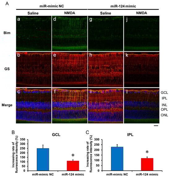 (A) Photomicrographs showing immunohistochemistry with anti-Bim antibody (a,d,g,j) and anti-GS antibody (b,e,h,k) of the retinas. The eyes were excised 12 h after intravitreal injection of saline (vehicle) or 40 nmol/eye NMDA. The eyes were treated with 10 nmol/eye miR mimic NC and saline (a,b,c), 10 nmol/eye miR-124 mimic and saline (g,h,i), 10 nmol/eye miR mimic NC and 40 nmol/eye NMDA (d,e,f), and 10 nmol/eye miR-124 mimic and 40 nmol/eye NMDA (j,k,l). miR mimic and its NC were injected intravitreally 18 h before intravitreal NMDA injection. Panels (c,f,i,l) (Merge) show the immunostainings with anti-Bim antibody (green) and anti-GS antibody (red) merged with nuclear counterstaining with DAPI (blue). GCL: the ganglion cell layer, IPL: the inner plexiform layer, INL: the inner nuclear layer, OPL: the outer plexiform layer, and ONL: the outer nuclear layer. Scale bar is 50 μm. Original magnification, ×400. (B,C) Effect of miR-124 mimic on the increase in the expression of Bim induced by NMDA, examined 8 h after intravitreal NMDA injection. The increasing rates of fluorescent intensity by NMDA in GCL (B) and IPL (C) are shown. Each datum is presented as mean ± SEM of 5 independent experiments. * p < 0.05 vs. miR mimic NC.