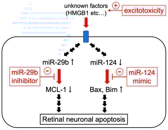 In conclusion, this is the first study to demonstrate that the miR-29b inhibitor and miR-124 mimic have neuroprotective effects against retinal injury induced by intravitreal NMDA via a reduction in apoptosis (Figure 9). Prevention of the downregulation of MCL-1 by the miR-29b inhibitor and that of the upregulation of Bax and Bim by the miR-124 mimic are possibly involved in the underlying mechanisms. The present study suggests that expressional changes in miR are involved in the excitotoxicity of RGCs, and that the rescue and/or inhibition of microRNA may be a potential therapeutic approach for diseases related to the excitotoxicity of RGCs, such as glaucoma and retinal central artery occlusion.