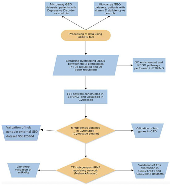 Here, we analyzed public transcriptome datasets from individuals diagnosed with MDD and VDD, aiming to identify the hub genes within the regulatory networks of commonly differentially expressed genes (DEGs). GEO (Gene Expression Omnibus) microarray datasets [28] were downloaded and subjected to GEO2R analysis, followed by identification of the common differentially expressed genes. The shared DEGs network was next subjected to protein–protein interaction (PPI) and pathway analysis to reveal the connected mechanism between the two conditions. Finally, we constructed a network of transcriptional (transcription factors—TFs) and post-transcriptional (microRNAs) co-regulators of the identified hub genes.