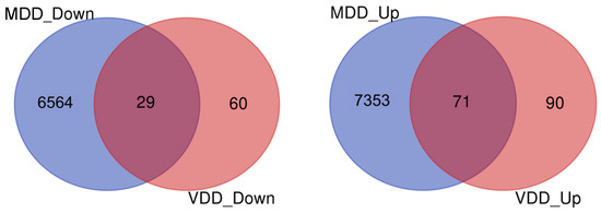 Venn diagram of downregulated (left) and upregulated (right) differentially expressed genes in major depressive disorder—MDD (blue) and vitamin D deficiency—VDD (red).
