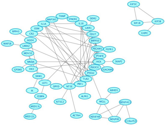 The depD list of 100 DEGs was uploaded on STRING, and the PPI network was constructed at a medium (0.400) confidence level; the network’s edges represent interaction evidence retrieved from all seven possible sources (text mining, neighborhood, experiments, gene fusion, databases, co-occurrence, and co-expression). The PPI network included 98 nodes and 89 edges with a statistically significant PPI enrichment (p-value = 0.01). The results were then imported to Cytoscape software version 3.9.1 for visual analysis (Figure 3).