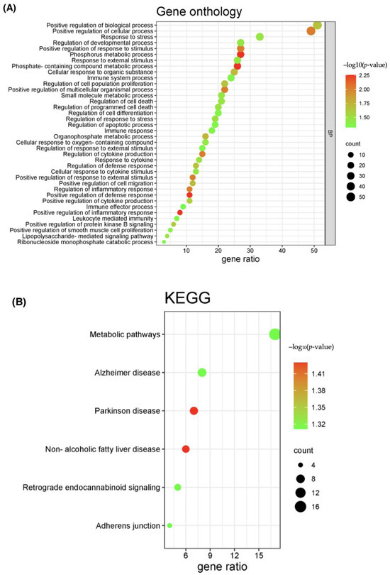 GO enrichment analysis showed that this network is significantly enriched in biological processes related to the cellular response to stress, with a significant immunological component, like positive regulation of the defense and inflammatory response (GO:0050729), immune response (GO:0006955), and regulation in response to external factors and stress (GO:0080134) (Figure 4a). This suggests that the immune and inflammatory responses link the pathophysiology of the two conditions. A similar analysis of the KEGG pathways enrichment led to six distinct pathways, the most significant being metabolic pathways (hsa01100), followed by Alzheimer’s (hsa05010) and Parkinson’s disease (hsa05012) (Figure 4b). This suggests that the transcriptome changes shared by the two conditions might represent the molecular substrate of metabolic alterations related to neuronal degenerative processes. Details regarding GO enrichment analysis and KEGG pathways are provided in Supplementary Table S2.