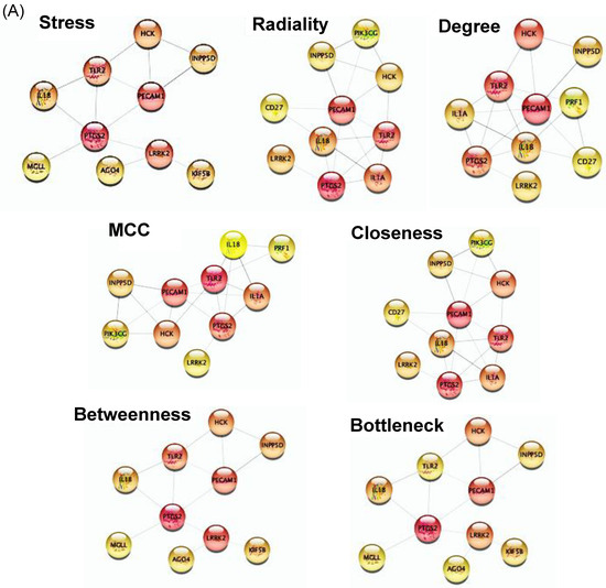 In order to identify the hub genes within the PPI network, data were uploaded and analyzed using cytoHubba, a Cytoscape plug-in designed to identify a network’s critical genes according to their number of associations. The top 10 genes were selected in each of the seven analytical algorithms used, and the final six hub genes were identified in the uPSet diagram: PECAM1, TLR2, PTGS2, LRRK2, HCK, and IL18, all upregulated (Figure 5 and Table 2).