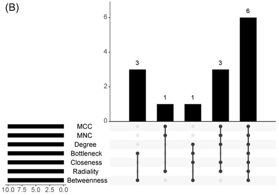 We used the Cytoscape plug-in CytoHubba to identify the significant hub genes in the depD PPI network, applying seven node-ranking methods (MCC—maximal clique centrality, degree, closeness, betweenness, bottleneck, radiality, and stress). We used an UpSet plot generated with the UpSetR package (version 1.4.0) [75] rather than a Venn plot to better display the intersections between the seven datasets. The top 10 hub genes, ranked according to all seven algorithms, were then visualized, and the common hub genes were identified.