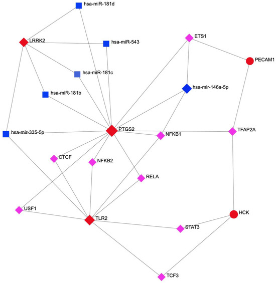 Next, we used NetworkAnalyst to build the network (trimmed down to a minimum of two-degree connectivity) of transcriptional and post-transcriptional regulators of hub genes, focusing on TFs and microRNAs, respectively. The final network (20 nodes and 66 edges) included six miRNAs and nine TFs targeting five of the six hub genes (PECAM1, TLR2, PTGS2/COX2, LRRK2, and HCK) (Figure 6). Of note, PTGS2, the only hub gene controlled by both microRNA and TFs, has the highest (33) connectivity degree and, thus, represents a potential link in the clinical development of depression and hypovitaminosis D. Of the nine TFs, TFAP2A is predicted to concomitantly regulate three hub genes (PTGS2, PECAM1, and HCK), while the rest (ETS1, NFKB1, TCF3, STAT3, RELA, USF1, NFKB2, and CTCF) might each regulate two of the hub genes. Of the six microRNAs, hsa-mir-335-5p and hsa-mir-146a-5p display three-degree connectivity in the hub DEGs network, while hsa-miR-181b, hsa-miR-181c, hsa-miR-181d, and has-miR-543 simultaneously regulate two hub genes, PTGS2 and LRRK2 (Supplementary Table S4).