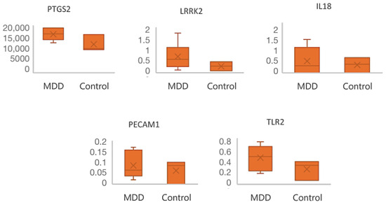 The validation of hub genes in external dataset GSE125664, in which the expression level of each hub gene from the MDD group was compared against the control group (healthy patients).