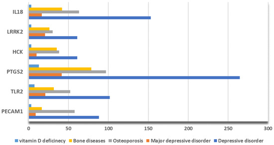 Next, we interrogated the Comparative Toxicogenomic Database (CTD) for the interference score and the reference count of the six depD hub genes. We found that they are significantly connected to depressive disorder, major depressive disorder, osteoporosis, bone diseases, and vitamin D deficiency. This suggests that all six hub genes participate in multiple pathophysiological processes associated with both pathological conditions. Of note, the average hub gene inference scores are higher in depression compared to vitamin D deficiency, with the maximum for PTGS2 (Figure 8 and Supplementary Table S3).