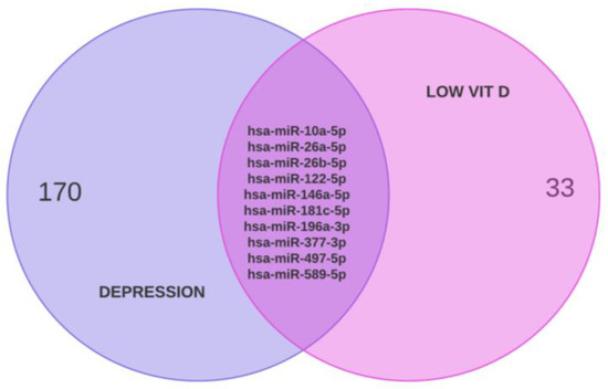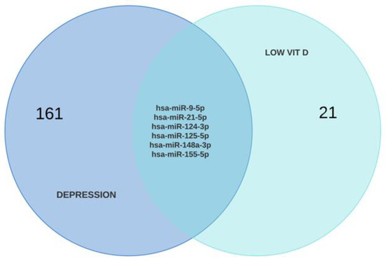 To further validate the identified microRNAs, we interrogated PubMed for microRNAs dysregulated in depressive patients (38 research papers) and hypovitaminosis D (19 research papers) (Supplementary Table S5). After removing the duplicates, we identified six commonly upregulated and ten commonly downregulated microRNAs (Figure 9).
