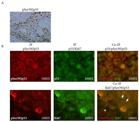 (A) Expression of pSer392p53 using immunohistochemistry showing exclusively nuclear coherent with the nuclear export inhibition of the phosphorylated form of p53; (B) Co-immuno- fluorescence of pSer392p52 (red) with p53 (green, upper panel) and Ki67 (green, lower panel) showing the co-localization p53 and pSer392p53 (upper panel), and also of pKi67 with pSer392p53 in the invasive front in some cells (arrows) but not all (star) (lower panel); IF: immunofluorescence, pSer392p53: Serine 392 phosphorylated p53.