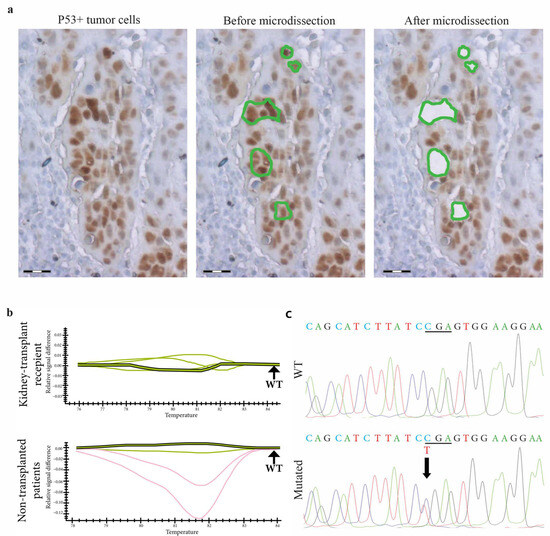 In addition, on laser-microdissected p53-expressing cancer cells (Figure 3), there was no difference between the two groups in terms of mutation prevalence, which was low: 18% vs. 8%, respectively, in non-transplanted vs. transplanted patients (p = 0.8) (Table 2).