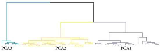 Dendrogram of the hierarchical cluster analysis showing the three clusters identified using principal component analysis.