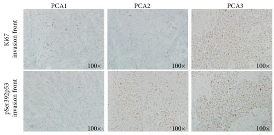 Using immunohistochemistry, a higher Ki67 expression is observed in both the tumor center and the invasive front in the PCA3 cluster, compared to PAC1 and PCA2.