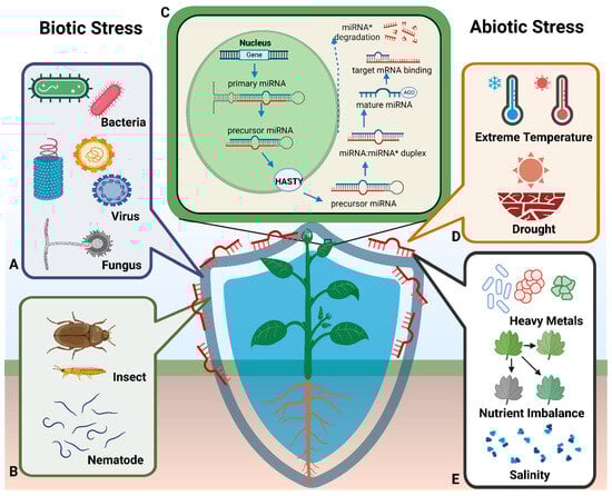 miRNA synthesis in plants and associated plant responses to abiotic and biotic stress. (C) Summary of the miRNA synthesis process in plants: pri-miRNAs are translated in the nucleus, processed into pre-miRNAs by the DCL1 enzyme, and transported to the cytoplasm via HASTY, where mature miRNAs are generated. (A,B) Associated biotic stress (e.g., microorganisms and insects). (D,E) Associated abiotic stress (e.g., extreme temperature, drought, heavy metal stress, nutrient stress, and salt stress).