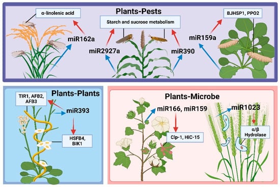 Recently, plant miRNAs have been shown to protect against insect damage by regulating plant growth and development. In addition, some plant miRNAs enter the body of feeding insects and regulate insect growth and development, exerting a significant effect on natural plant–pest interactions [120]. For example, Chen et al. found that brown planthopper damage to rice induces the expression of rice miR162a. This initiates a defense response against infestation by down-regulating brown planthopper reproduction and development via transboundary silencing and inhibiting the α-linolenic acid metabolic pathways in rice, reducing brown planthopper host selectivity. Indeed, the JA-mediated defense response has created long-term evolutionary competition between the pest and host [20]. Alternatively, Zhang et al. identified plant-derived miRNAs in the hemolymph of the cruciferous cabbage moth, Cechetra minor. They reported that these miRNAs can enter the circulatory system by penetrating the midgut barrier; notably, these plant-derived miRNAs may play regulatory roles in C. minor [121]. Similarly, 13 sorghum and 3 barley miRNAs were detected in two cereal aphids, Schizaphis graminum and Sipha flava; the associated target genes were predicted to participate in aphid defense by inhibiting starch and sucrose metabolism [122]. Similar to the involvement of miRNAs in plant–microbe cross-species regulation, plant-derived miRNAs can regulate insect target genes; insect-derived miRNAs can enter the plant via the saliva, contributing to interspecies communication between the plant and insect [120,123].
