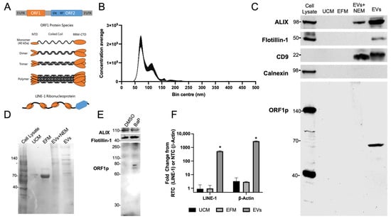 Cells and EVs were lysed in RIPA buffer and subjected to Western blotting as described []. Immunoblots were imaged using a Konica Minolta SRX101A film developer (Konica Minolta Medical & Graphic, Inc., Tokyo, Japan). The ORF1p polyclonal antibody used was custom-made using the 14-amino acid N-terminus of the ORF1p protein (ORF1p1-14). The specificity of this antibody has been confirmed in previous studies []. The monoclonal ORF1p antibody used was purchased from Millipore-Sigma (MABC1152). Antibodies to ALIX (CST, 92880), CD9 (CST, 13403), Flotillin-1 (CST, 18634), GAPDH (CST, 2118), and Calnexin (MA5-31501) were obtained commercially via Cell Signaling Technology (Danvers, MA, USA) and ThermoFisher.