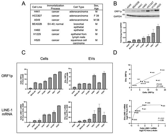 We next determined whether EV LINE-1 content serves as a proxy of cellular LINE-1 levels (Figure 2). A panel of cells that included the non-transformed bronchial epithelial line, BEAS-2B, along with several NSCLC epithelial cell lines was examined (Figure 2A). Cells were allowed to condition EV-depleted media for 48 h before the collection of cell and media fractions. Western blotting showed constitutive ORF1p expression across all lines (Figure 2B). A549 cells exhibited the lowest levels of ORF1p, followed in ascending order by BEAS-2B, H441, H1299, H460, H827, and H520 cell lines. As A549 cells consistently exhibited the lowest LINE-1 levels, all subsequent LINE-1 measurements were expressed as a fold change relative to A549 cells or A549 EVs.