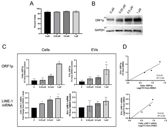 LINE-1 induction by BaP increases LINE-1 mRNA and ORF1p export in EVs. H460 cells were challenged with different concentrations of the LINE-1 inducer, benzo[a]pyrene (BaP), for 48 h before cells and conditioned media were collected. (A) Cell viability was unaffected by BaP treatment, as measured by Trypan Blue exclusion. (B) Representative Western blot depicting cellular ORF1p expression across BaP treatments. (C) ORF1p was measured by ELISA in cells ((C), top left) and EVs ((C), top right). LINE-1 mRNA was quantified using One-Step qPCR within cells ((C), bottom left) and EVs ((C), bottom right). BaP treatments were compared to DMSO control by one-way ANOVA with Dunnett’s multiple comparisons ((A,C), top row, bottom left) and Kruskal–Wallace with Dunn’s multiple comparisons ((C), bottom right) (* p < 0.05). (D) LINE-1 values were compared between cells and EVs using linear regression. Means ± SEM are shown. N = 4.