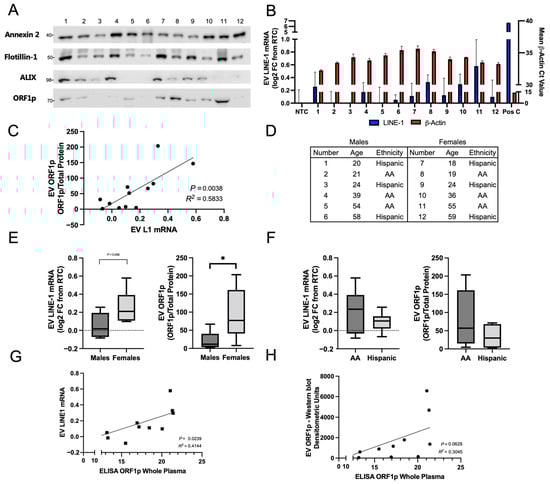 LINE-1 Analyte Profiles in Human Plasma-Derived EVs from Ostensibly Healthy Subjects. Plasma from 12 ostensibly healthy human subjects was used in these experiments. EVs were isolated from plasma by ultracentrifugation and resuspended in equal volumes of PBS. EV inputs were normalized by the total volume of input plasma (3 mL). Half of the preparation was used for protein analysis via Western blotting and the other for LINE-1 mRNA quantification. (A) Immunoblot of plasma EVs. Annexin 2, Flotillin-1, and ALIX were used as positive controls, as they are enriched in many types of EVs. An ORF1p dimer was detected in EVs. (B) EV mRNA quantification. LINE-1 (left y-axis) was expressed as an FC from RTC. β-Actin detection was used as a positive control (right y-axis). (C) The relationship between EV LINE-1 mRNA and ORF1p content was assessed by simple linear regression. (D) Matched age (within 2 years), sex, and race of plasma donors. African American, “AA”. Mean EV LINE-1 mRNA ORF1p content were compared between males and females (E) and black and Hispanic subjects (F) using unpaired t-tests. The patterns in (C,E,F) exhibited no association with slight variations in EV protein levels (Figure S2). * p < 0.05. F. Whole plasma ORF1p measurements were examined as a predictor of EV LINE-1 content. ORF1p was measured by ELISA in 120 μL of whole plasma and these measures were then compared to measures of EV LINE-1 mRNA (A) and ORF1p (B) using a simple linear regression. Bulk plasma ORF1p in ostensibly healthy subjects using ELISA was compared to LINE-1 mRNA (G) and EV ORF1p (H).