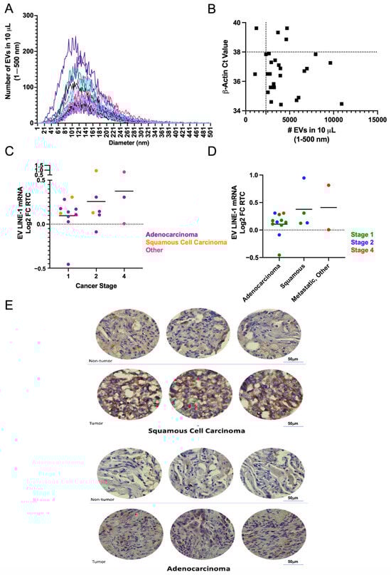 Using a single-blinded approach, LINE-1 mRNA was measured in plasma EVs from 28 patients who underwent lung resection surgery for a lung lesion. EVs were isolated from 250 μL of plasma and processed for measurements of LINE-1 mRNA. The presence of EVs in these preparations was verified by NTA (Figure 5A). As a quality control, samples from six donors with less than 2300 particles and a β-Actin Ct greater than 38 were excluded from further analysis (Figure 5B). Stratification of EV mRNA profiles based on cancer stage and histopathology showed that Stage 1 subjects had lower EV LINE-1 levels than those with Stages II and IV (Figure 5C). Notably, not all Stage II and IV tumors exhibited high LINE-1 levels suggesting that the heterogeneity of response may be present. While mean LINE-1 levels did not significantly differ between squamous cell carcinomas and adenocarcinomas, a trend for higher levels in squamous cell carcinomas and metastatic tumors emerged (Figure 5D). The profile of EV LINE-1 mRNA content in NSCLCs paralleled the patterns of ORF1p expression in NSCLC tissue sections compared to non-tumor tissue (Figure 5E).