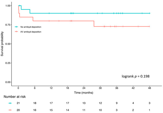 Survival probability of AS patients with and without isolated AV amyloid deposition. No survival differences were observed between patients with and without isolated AV amyloid deposition.