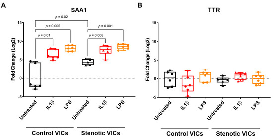 SAA1 and TTR gene expression in human-isolated valve interstitial cells. Box–Whisker plots representing SAA1 (A) and TTR (B) gene expression in valve interstitial cells (VICs) isolated from human control aortic valves (control VICs, n = 6) and human stenotic aortic valves (stenotic VICs, n = 6) under basal conditions (untreated) and after IL-1β or LPS stimulation. The fold changes were calculated against the untreated condition of the control VICs, which is the baseline for comparison. The statistical significance of the differences between the groups was tested by one-way ANOVA and post-hoc comparisons with Bonferroni’s multiple comparisons test.