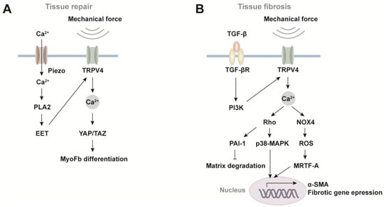 TRPV4 mediated signaling pathways. (A) TRPV4 signaling in tissue repair. Ca2+ influx through Piezo channel activates PLA2 with elevated production of EET. EET sensitizes TRPV4 activation in response to mechanical cues. TRPV4-evoked Ca2+ influx and subsequent Ca2+ oscillation activate downstream YAP/TAZ to promote myofibroblast (MyoFb) differentiation. (B) TRPV4 signaling in tissue fibrosis. TGF-βR activation induces PI3K, leading to Ca2+ influx via TRPV4. Ca2+ signal further activates Rho/Rho kinases, inhibiting matrix degradation via PAI-1, and upregulating fibrotic gene expression via p38-MAPK. TRPV4-induced Ca2+ signal also interacts with NOX4 to promote ROS production and nuclear translocation of MRTF-A, the coactivator of α-SMA expression. PLA2, phospholipase A2; EET, epoxieicosatrienoic acids; YAP/TAZ, yes-associated protein/transcriptional coactivator; MyoFb, Myofibroblast; PI3K, phosphatidylinositol 3-kinase; PAI-1, plasminogen activator inhibitor 1; MAPK, mitogen-activated protein kinases; NOX4, NADPH Oxidase 4; ROS, reactive oxygen species; MRTF-A, myocardin-related transcription factor A.