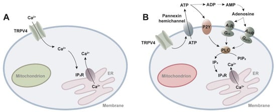 Ca2+ influx from outside the cell via TRPV4 evokes Ca2+ release from internal storages, termed “Ca2+-induced Ca2+ release”. This process is mediated through IP3R calcium ion channels in the ER of astrocytic endfeet, causing repetitive Ca2+ oscillations [59] (Figure 3A). When extracellular Ca2+ is removed, intracellular Ca2+ responses in chondrocytes can be completely suppressed, highlighting the necessity of extracellular Ca2+ for the onset of Ca2+ signaling [60]. Of note, the same phenomenon is also found in pulmonary fibroblasts [61]. Under abnormal circumstances, the equilibrium of mitochondrial membrane potential can be disrupted by elevated ATP production, thermogenesis, or mitochondrial dysfunction [62], including factors such as hyperoxia and pharmacologic uncoupling of mitochondrial oxidative phosphorylation [63,64]. These conditions lead to an increase in the levels of reactive oxygen species (ROS) surrounding the mitochondria [65]. Consequently, the release of Ca2+ is triggered through a more intricate pathway (Figure 3B). TRPV4 activation induces ATP release through pannexin hemichannels, whereupon ATP stimulates plasma membrane-bound purinergic receptors (P2Y), which activate phospholipase C (PLC) to produce IP3, eventually culminating in the activation of IP3R Ca2+ channels [64]. Moreover, ATP released through pannexin into the extracellular space undergoes degradation into ADP, AMP, and adenosine by ectonucleoside triphosphate diphosphohydrolase (ENTDPase) and ecto-5′-nucleotidase (ecto-5′-NT) [66,67]. Adenosine, a key player in this process, exerts its effects by binding to four distinct receptor subtypes—A1R, A2AR, A2BR, and A3R—belonging to the G-protein coupled receptor (GPCR) family [68]. When A1R is coupled to the Gi/0 proteins and A2BR is coupled to the Gq/11 proteins, the stimulation of PLC promotes the cleavage of phosphatidylinositol 4,5-bisphosphate (PIP2) into diacylglycerol (DAG) and IP3, which in turn increase intracellular Ca2+ levels [69]. In addition to the modulation of mitochondrial membrane potential, it has been documented that TRPV4 activation in hippocampal neurons leads to the depolarization of the resting membrane potential. Notably, heat stimulation induced depolarization exclusively in TRPV4-positive neurons, while TRPV4-negative or TRPV4-KO neurons did not exhibit such changes [70,71]. Furthermore, TRPV4 activation through hypotonic stimulation or the TRPV4 agonist 4α-PDD initiates NMDA-activated currents in hippocampal CA1 pyramidal neurons, with the inward current demonstrating a dose-dependent relationship to 4α-PDD [72]. Simultaneously, TRPV4 activation inhibits GABA-activated currents and increases glycine-activated currents [73,74].