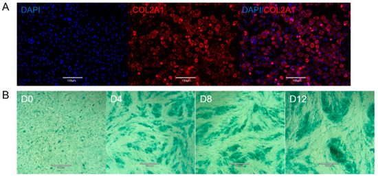Identification of primary porcine vertebral chondrocytes (PVCs). (A) Immunofluoresence of primary PVCs. (B) Alcian blue staining plots of PVCs on days 0, 4, 8, and 12 of differentiation.